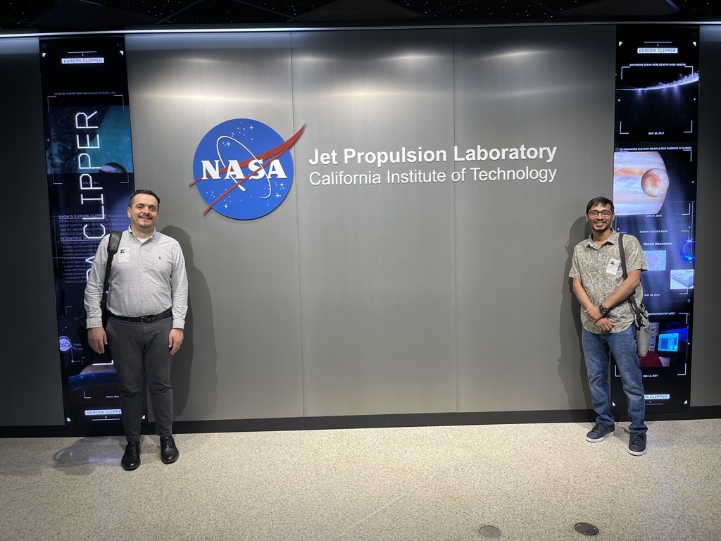 September, 2025: Soares and the graduate student Md Zawad Hossain visited the Electrochemical Research, Technology, & Engineering Group at NASA Jet Propulsion Laboratory (JPL) in Pasadena, California to discuss the project sponsored by NASA KS EPSCoR. Thank you to our collaborators at NASA JPL team for the warm reception and great discussions! Picture from the visit.